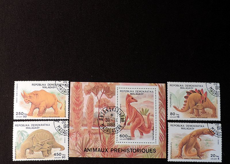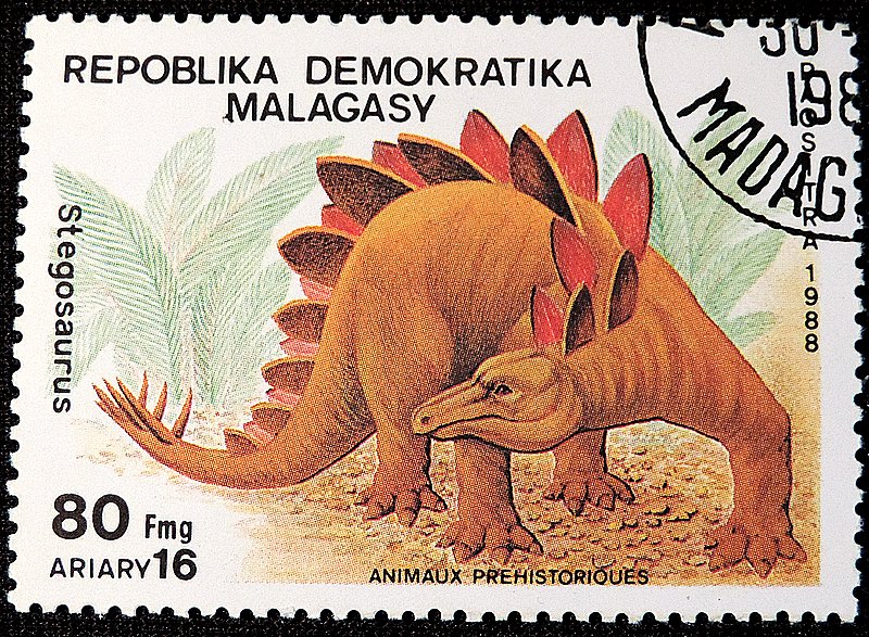 Описание — Стегозавр (лат. Stegosaurus) — род травоядных динозавров-тиреофор из Северной Америки, обитавший в позднем юрском периоде 155—150 млн лет назад. Стегозавры употребляли лишь растительность, т.к. их зубы не позволяли жевать что-то более жесткое. Также стегозавр глотал целиком камни, которые в желудке они перетирали листья и способствовали улучшению пищеварения. У данного динозавра была отличная защита, по всему телу располагались твердые костные наросты, отлично защищавшие его горло, ноги и туловище. На спине располагаются в 2 ряда пластины различных размеров, наибольшие пластины вырастали до 1м. Они не отличались особой прочностью и использовались больше для запугивания, чем для защиты. При появлении врага пластины окрашивались в красный цвет (цвет опасности), что отпугивало хищников, а также помогало соперничать за самок с другими самцами этого вида. Кроме того спинные пластины были терморегулятором, который накапливал тепло и отводил его избыток. А вот на хвосте были расположены очень острые шипы, произведя удар хвостом, мог оглушить своего нападающего и даже убить. Количество таких шипов могло быть до 4х штук, а их длина была от 70см до 1 метра. В длину достигал 9м (самый большой стегозавр был найден в Аризоне – 9м 79см). В высоту стегозавр был не больше 4м. Масса тела – 5-7тонн. Голова была небольшая, особенно, если учесть огромное тело динозавра. Череп в длину не привышал 40см.