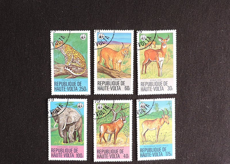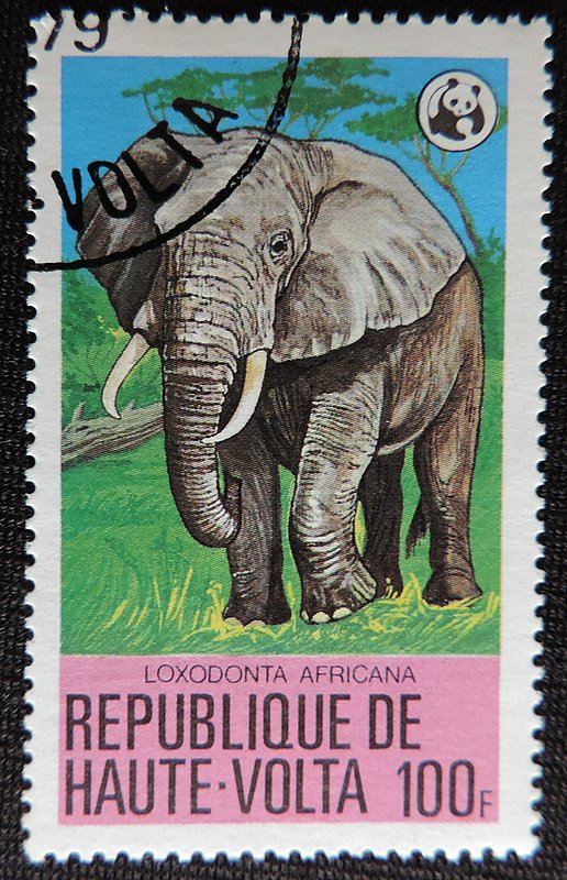 Надпись на марке — Loxodonta africana — Сава́нный слон (лат. Loxodonta africana) — млекопитающее из рода африканских слонов отряда хоботных. Является самым крупным из ныне живущих наземных животных. Согласно «Книге рекордов Гиннесса», это самое крупное наземное млекопитающее. Самым крупным экземпляром из когда-либо зарегистрированных в Книге рекордов был самец, застреленный 7 ноября 1974 года в Мукуссо (Ангола), его вес составил 10,4 т. Длина тела достигает 6—7,5 м, высота в плечах (наивысшая точка тела) — 3—3,8 м. Средняя масса тела у самок 5 тонн, самцов — 7 тонн. Огромные уши (длиной от основания до вершины 1,2—1,5 м) являются эволюционным приспособлением к жаркому климату. За счёт большой площади и развитого кровоснабжения они помогают слону избавляться от избытка тепла. Двигая ушами, слоны обмахиваются ими, как веером. Рисунок вен на поверхности ушей слона так же индивидуален, как и отпечатки пальцев у человека. С его помощью можно идентифицировать слона. Помогают в идентификации также дыры и надрывы на краях ушей. Слоны плохо видят (на расстояние не более 20 м), однако у них прекрасное обоняние и слух. Несмотря на массивное сложение, слоны удивительно подвижны. Они хорошо плавают или передвигаются по дну водоёма, выставив над водой только хобот. Обычная скорость передвижения — 2—6 км/ч, но на короткое время животные могут развивать скорость до 35—40 км/ч. Спят слоны стоя, собравшись вместе в плотную группу, только детёныши ложатся на бок на землю.
