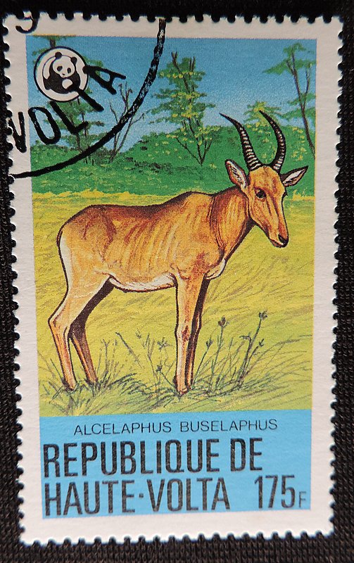 Надпись на марке — Alcelaphus buselaphus — Конго́ниили обыкновенный бубалили коровья антилопаили степной бубал(лат. Alcelaphus buselaphus) — вид антилоп семейства полорогих. Длина тела у этого крупного вида составляет 2 м, высота в холке около 130 см, а вес достигает почти 200 кг. Конгони активны в дневное время и живут в стадах. Хотя их походка из-за различной длины передних и задних ног выглядит несколько неуклюже, убегая от хищника эти антилопы могут достигать почти 80 км/ч. Конгони являются типичными травоядными животными, которые однако время от времени питаются также листвой с кустарников. По возможности они стараются регулярно пить, однако могут выживать долгое время без воды.