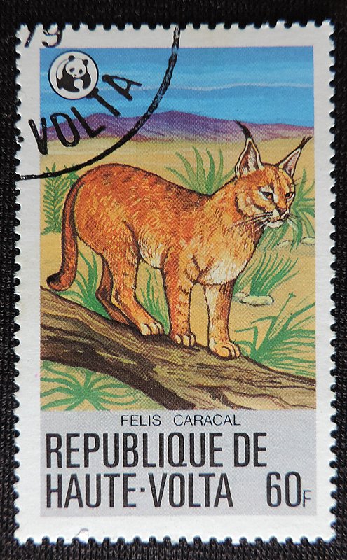 Надпись на марке — Carakal — Карака́л, или степная рысь (лат. Caracal caracal от тюркского «кара-кылак» — чёрное ухо и казахского «кара-кал» (қарақал) — чёрная кисть) — хищное млекопитающее семейства кошачьих. Внешне напоминает рысь, но меньше размерами, стройнее и с однотонной окраской. Длина тела 65—82 см, хвоста — 25—30 см, высота в холке около 45 см; масса — 11—20 кг. Уши с кисточками (до 5 см) на концах. На лапах развита щётка из жёстких волос, облегчающая передвижение по песку. Название «каракал» происходит от тур. karakulak «чёрное ухо», так как задняя сторона ушей у этих кошек чёрная. Хотя у каракала длинные ноги, долго бежать, как и все кошачьи, он не может, поэтому охотится, скрадывая жертву и настигая её большими (до 4,5 м в длину) прыжками. Обладая необычайной скоростью реакции и очень острыми втяжными когтями, каракал способен выхватить несколько птиц из взлетающей стаи. Однако главной пищей ему служат грызуны (песчанки, тушканчики, суслики), зайцы, отчасти мелкие антилопы.