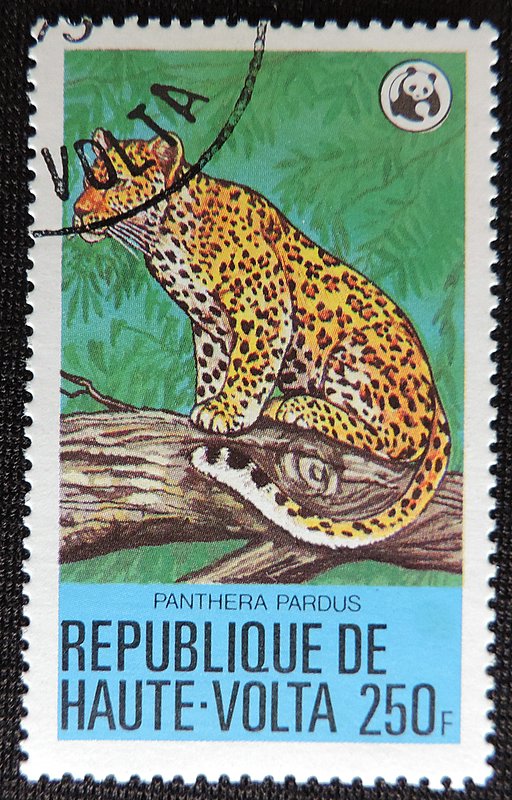 Надпись на марке — Panthera pardus — Леопа́рд, или барсили пантера (лат. Panthera pardus) — вид хищных млекопитающих семейства кошачьих, один из четырёх представителей рода пантера. Крупная кошка, однако, по величине значительно меньше тигра и льва. Длина тела без хвоста — 90—190 см, (в среднем 160 см) длина хвоста 60—110 см. Масса самок — 32—65 кг, самцов — 60—75 кг. Высота самцов в холке — 50—78 см. Леопарды – это животные осторожные и скрытные, но при этом очень смелые. Они не убегают, а спокойно отступают при встрече с человеком. Унося добычу на глазах людей, хищники не обращают внимания на крики и даже выстрелы. Спортивная охота на леопарда в разрешенных местах считается одной из самых опасных, так как раненый зверь, в отличие от многих хищников, бросается на охотника. Многие леопарды ведут оседлый образ жизни. Логово леопарды обычно размещают на склонах, чтобы иметь хороший обзор. Для убежища они используют пещеры, прикорневые дупла деревьев, россыпи камней, навесы скал, бурелом. В спокойном состоянии леопард передвигается шагом, ступая легко и грациозно. Но он способен срываться на галоп, при этом максимальная скорость бега леопарда достигает 60 км/ч. Также хищники могут делать огромные прыжки до 7 м в длину и 3 м в высоту. Кроме того, леопарды хорошо плавают и могут преодолевать значительные водные преграды, но делать этого не любят.