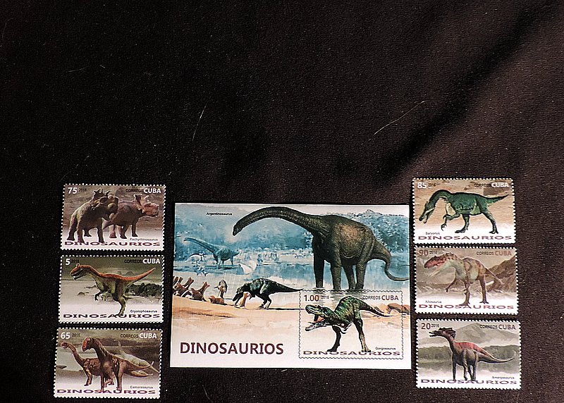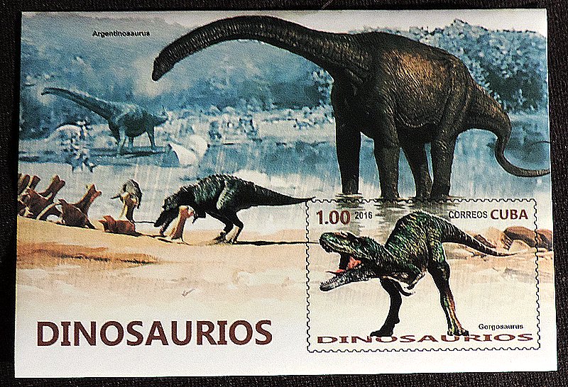 Вокруг марки по полю блока изображен Аргентинозавр.