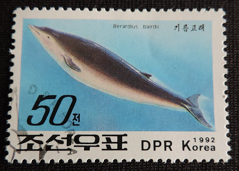 Надпись на марке — «Berardius bairdii» — Се́верный плаву́н, или дальневосто́чный бутылконо́с (лат. Berardius bairdii) — морское китообразное млекопитающее из семейства клюворыловых подотряда зубатых китов. Второй по размеру, после кашалота, зубатый кит. Длина тела составляет 10,7—12,8 м, а вес около 8—11 т, крупные самки до 11—15 т. На каждой стороне нижней челюсти два крупных зуба. Под водой способен находиться до часа, при выныривании виден «клюв». Издаваемые этим китом звуки напоминают рёв быка. Как правило, моногамен. Образует небольшие стада. Главная пища плавунов — головоногие моллюски (в основном кальмары), а также придонная рыба (скаты и их яйца, морские ерши, подонемы, тресковые), крабы и крупные раки.