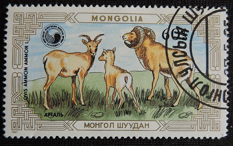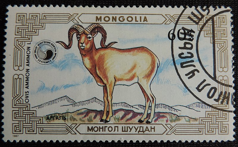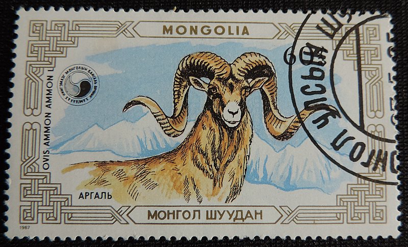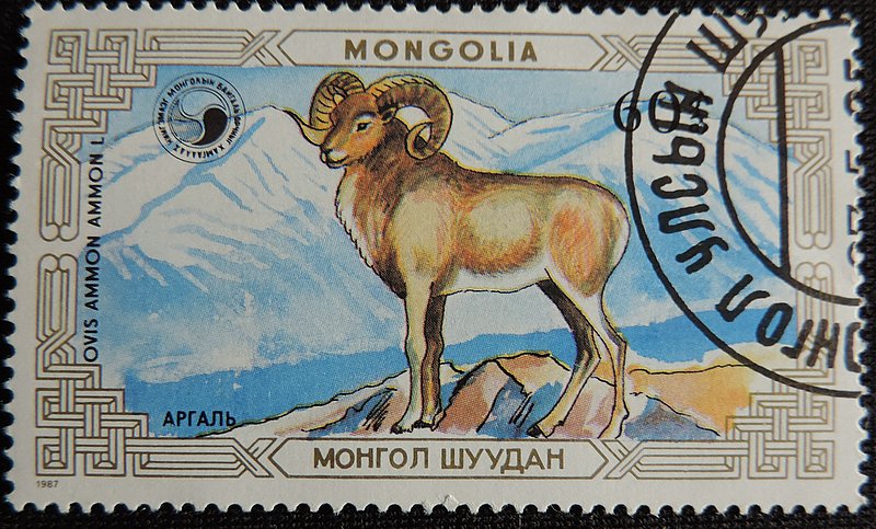 Надпись на марках — Арха́р, или го́рный бара́н, или аргали (лат. Ovis ammon) — парнокопытное млекопитающее из семейства полорогих, обитающее в горных районах Средней и Центральной Азии, в том числе и на юге Сибири. Это самый крупный представитель диких баранов — его длина составляет 120—200 см, высота в холке 90—120 см, а вес 65—180 кг. Архары обитают в горных и предгорных районах Средней и Центральной Азии на высоте 1300-6100 м над уровнем моря — на Памире, в Гималаях, Алтае, Саянах Монголии и Тибете. Предпочитают открытые пространства — степные склоны гор и предгорий со скалами, альпийские луга, заросшие кустарником скалистые ущелья, долины с каменистыми возвышенностями. Избегают густой древесной растительности.