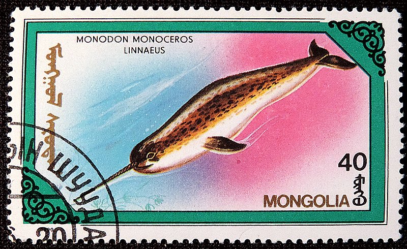 Нарвал (лат. Monodon monoceros) — Морское млекопитающее. Длина тела взрослого нарвала обычно достигает 3,8–4,5 м (в старину попадались экземпляры длиной 6 м), новорождённых — 1–1,5 м. Масса самцов достигает 2–3 т, из них примерно треть веса составляет жир; самки весят около 900 кг. Голова у нарвала необычной формы: круглая с выпирающим лбом. Рот и глаза маленькие, верхний плавник отсутствует, боковые плавники небольшие и слегка вытянутые. … Причем у самцов один из зубов развивается в длинный рог – бивень, который имеет спиралеобразный вид и может достигать трехметровой длины. Интересна не только сама структура бивня, но и его назначение. Большинство ученых не верило, что он может быть орудием нападения. Предполагалось, что он необходим при брачных играх, для привлечения самок, а также для пробивания лунок во льду. Питаются нарвалы головоногими моллюсками, в меньшей степени — ракообразными и рыбой, поедая в основном донных представителей ихтиофауны (треска, скаты, палтусы, камбала, бычки). В поисках пищи нарвалы ныряют на глубину до 1 км и подолгу остаются под водой; было замечено, что с грунта донных рыб нарвалы вспугивают при помощи своих бивней. Естественные враги нарвалов — белые медведи и косатки. На детёнышей также нападают полярные акулы.