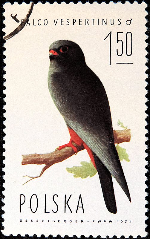 Кобчик (Самец) (лат. Falco vespertinus) — вид хищных птиц рода соколов. Мелкий сокол, пропорциями и поведением сходный с пустельгой, но менее ширококрылый. Длина птицы 28—33 см, длина крыла 23—35 см, размах крыльев 65—77 см, масса тела 130—197 г. Клюв короткий, относительно слабый. Самец тёмно-сизый (почти чёрный) с кирпично-красными низом брюха, подхвостьем и «штанами». Самка охристая с серыми (с поперечной полоской) спиной, крыльями и хвостом, с продольными пестринами на брюхе, с чёрными усами. Питается почти исключительно крупными насекомыми — стрекозами, жуками, кузнечиками и пр. Изредка ловит мелких грызунов, ящериц. Из птиц его добычей становятся в основном воробьи, но он может загнать и более крупную птицу, такую, например, как голубь. Может образовать колонии до 100 пар.