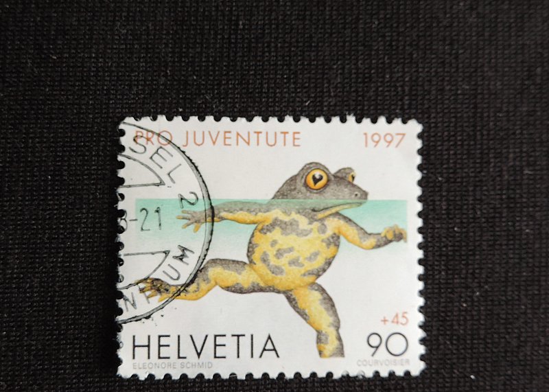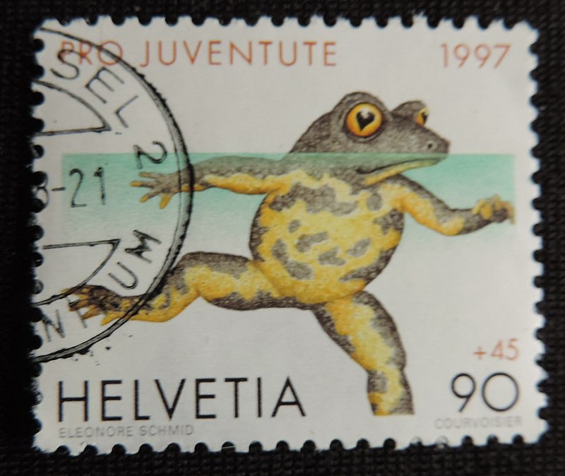 Надпись на марке — «Bombina variegata» — Желтобрюхая жерлянка (лат. Bombina variegata) — вид бесхвостых земноводных. Взрослые жерлянки редко достигают 35—55 мм в длину. Брюхо жёлтое с чёрно-серыми неровными пятнами и разводами. Узор пятен индивидуален для каждой лягушки.