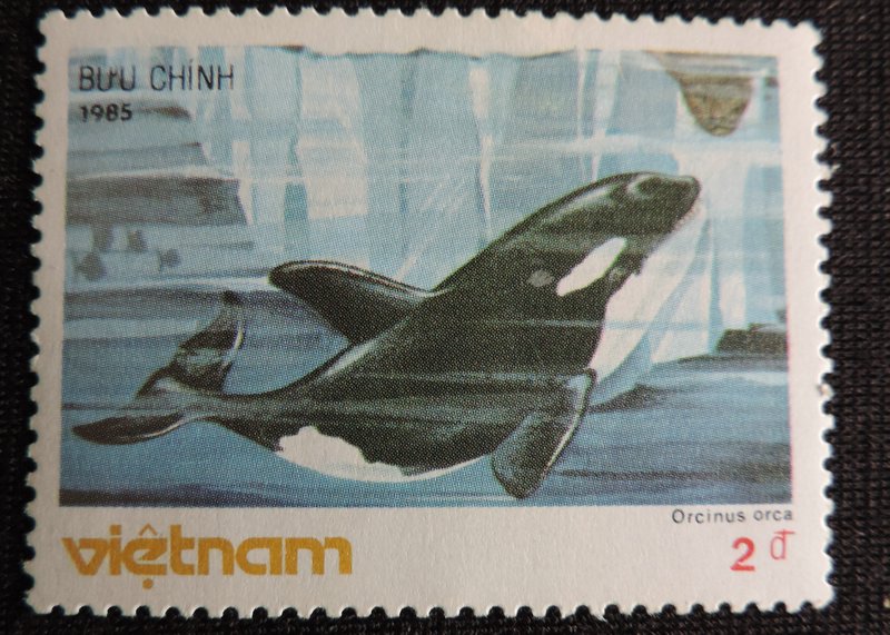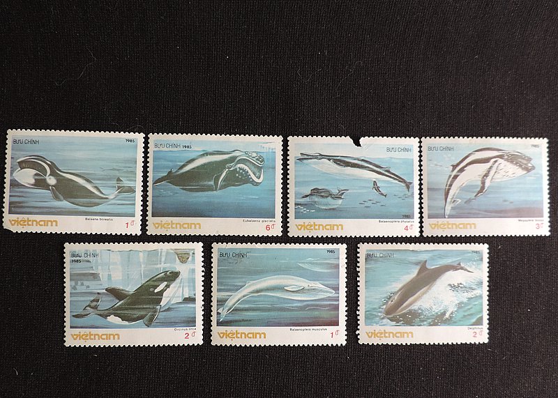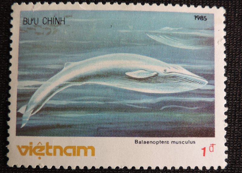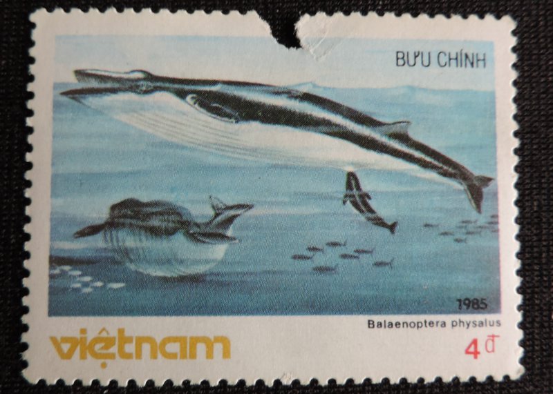 Надпись на марке — «Balaenoptera physalus» — Финва́л, или сельдяной кит, (лат. Balaenoptera physalus) — вид китов из семейства полосатиковых. Он является близким родственником синего кита и вторым по величине животным планеты. Взрослые особи, обитающие в Северном полушарии, достигают длину от 18 до 24 метров, в Южном полушарии финвалы несколько крупнее, будучи от 20 до 27 метров в длину. Вес от 40 до 70 тонн. Финвалы часто встречаются поодиночке, но охотно живут и в небольших группах величиной до шести особей. Изредка наблюдаются и более крупные группы. Финвал передвигается быстрее и умеет нырять глубже, чем большинство других крупных китов. Его скорость достигает 50 км/ч, а глубина погружения может превышать 230 метров. При этом он может проводить под водой около 15 минут без воздуха. Его пища состоит почти исключительно из криля, который фильтруется из воды через китовый ус. Однако финвал не брезгует и небольшими рыбами, плывущими в косяках. В день финвал потребляет до двух тонн