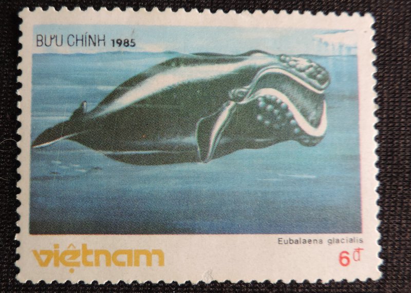 Надпись на марке — «Eubalaena glacialis» — Северный гладкий кит (лат. Eubalaena glacialis). Северный гладкий кит достигает, как правило, длины 13—16 м. Официально зафиксированная рекордная длина составляла 18 м, однако по слухам наблюдались особи и 21 м в длину. Масса этих колоссов составляет около 100 т. На каждой стороне пасти находятся около 300 усов. Ворвань (китовый жир, основной продукт промысла) может составлять до 40% общей массы тела и в этом отношении североатлантический гладкий кит является рекордсменом среди всех китов. Передвигается в воде весьма медленно, его скорость составляет лишь 8 км/ч. Североатлантические гладкие киты процеживают пищу через китовый ус. В нём остаются веслоногие раки и небольшие рыбы. Изначальная численность северного гладкого кита оценивается в 100 тысяч животных, однако в наше время существует лишь около 300 особей.