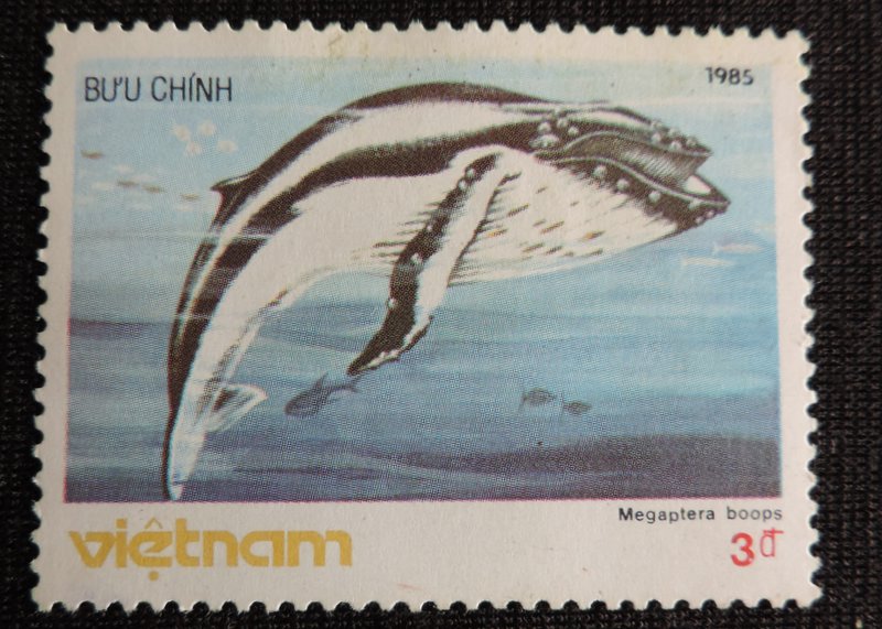 Надпись на марке — «Megaptera novaeangliae» — Горба́ч, или горба́тый кит, или длиннору́кий полоса́тик(лат. Megaptera novaeangliae) — морское млекопитающее семейства полосатиковых китов подотряда усатых китов. Горбач — довольно крупный кит. Средняя длина тела взрослой особи: 14,5 м для самок, 13,5 м для самцов. Средняя масса горбатого кита — 30 т. Горбатый кит более тихоходен, чем настоящие полосатики: его скорость при миграциях не превышает 8—15 км/ч. Максимальная скорость зафиксирована у раненых китов — до 27 км/ч. В то же время горбатый кит — один из самых энергичных и акробатичных больших китов, чьё поведение, включая эффектное выпрыгивание из воды, привлекает к нему внимание туристов. Летом они редко ныряют более, чем на 5 минут, и погружения, продолжительностью больше 10 минут, редки. Зимой погружения продолжаются 10—15 мин. (максимум 30 мин.). Питаются придонными и пелагическими ракообразными, стайной рыбой, реже головоногими и крылоногими моллюсками.
