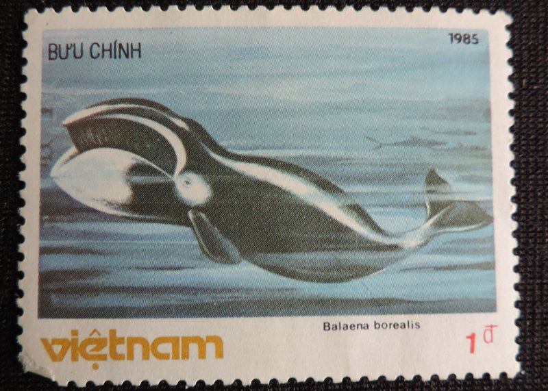 Надпись на марке — «Balaena mysticetus» — Гренландский кит, или полярный кит (лат. Balaena mysticetus) — морское млекопитающее подотряда усатых китов. Усатый кит, живущий в полярных районах Северного полушария. Максимальная длина: 20 м (самки) и даже 22 м[3]., 18 м (самцы); вес взрослого животного от 75 до 100 т и 150 т[4]. Ныряет на глубину до 200 м и может оставаться под водой до 40 минут. Средняя скорость — около 20 км/ч. Средняя продолжительность жизни — около 40 лет. Однако, возможно, отдельные особи могут дожить до 210 лет, что считалось рекордом среди позвоночных животных. Это косвенная оценка, вычисленная на основе измерения степени рацемизации аспарагиновой кислоты в теле кита, результаты оценки могут быть неточными. На основе того же метода выявлено ещё четыре самца, чей возраст превышает 100 лет.