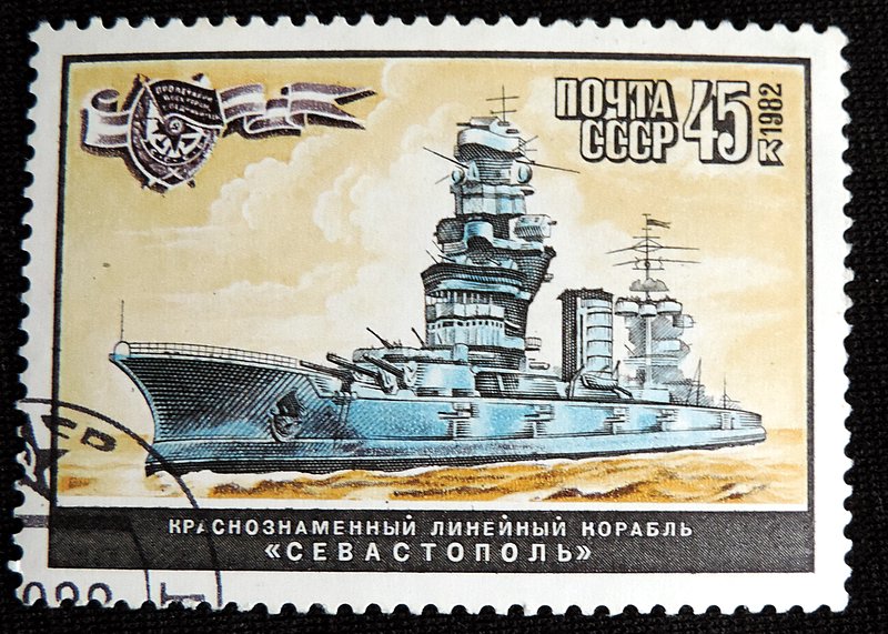 Надпись на марке — линкор «Севастополь» — За время войны корабль совершил 15 боевых походов, прошел 7700 миль и выполнил 10 артиллерийских стрельб, поддерживая советские войска под Севастополем и на Керченском полуострове. Средства ПВО корабля отразили 21 налет вражеской авиации, сбив 3 самолета противника.
