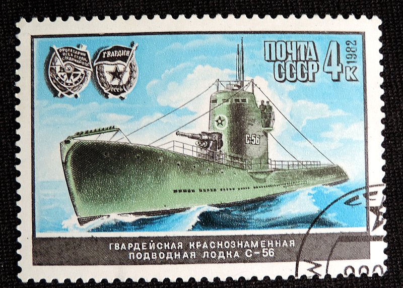 Надпись на марке — подлодка С-56. За годы войны С-56 совершила 8 боевых походов, произвела 13 атак с выпуском 30 торпед, потопив 10 кораблей и транспортов противника , нанесла серьезные повреждения, не совместимые с живучестью еще 4 кораблям, на подводную лодку было сброшено свыше 3 тысяч глубинных бомб. 31 марта 1944 года за боевые заслуги лодка С-56 награждена орденом Красного Знамени. 23 февраля 1945 года субмарина удостоена гвардейского звания. За время Великой Отечественной войны С-56 19 раз объявлялась погибшей
